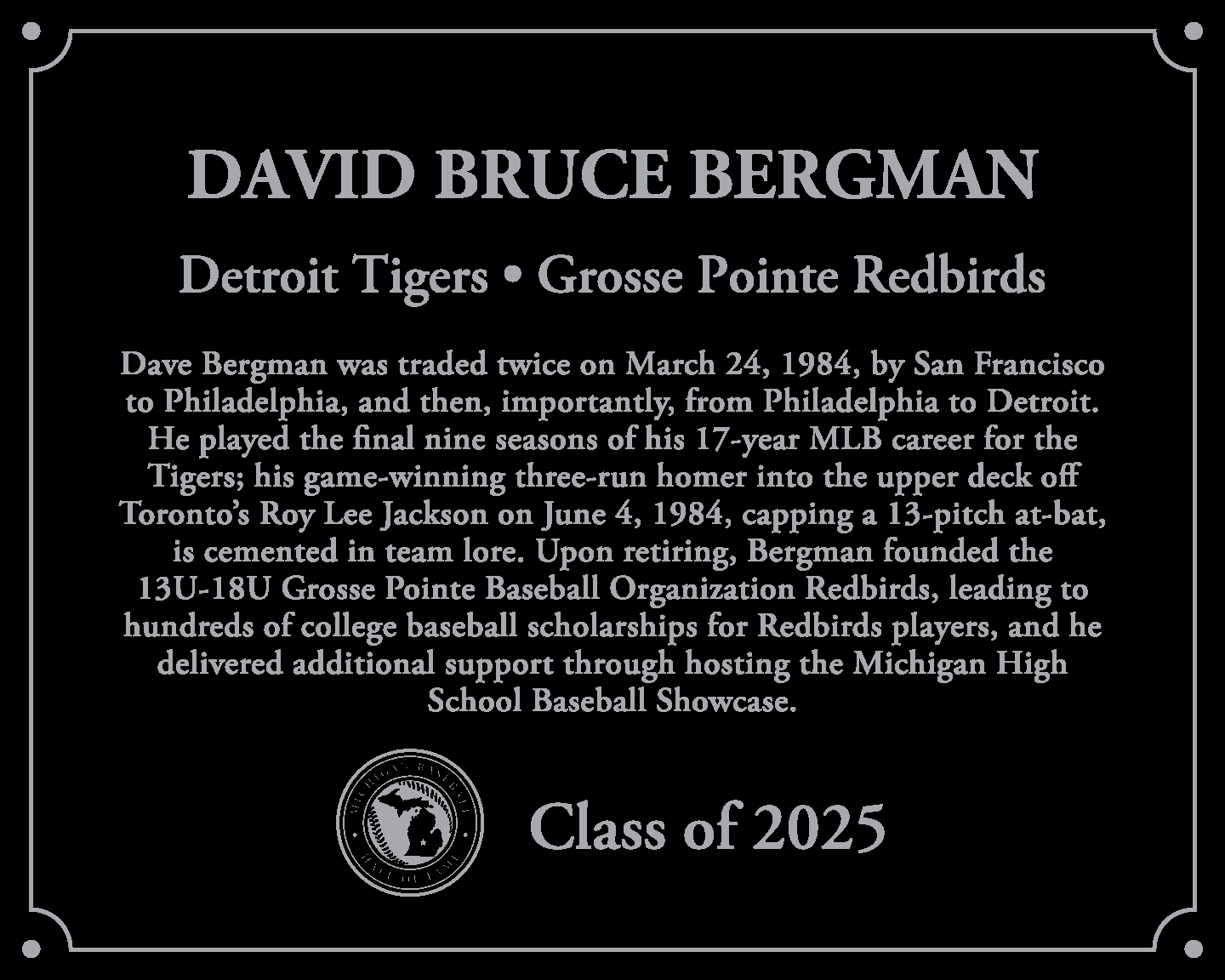 Upon his retirement from playing, Dave Bergman gave back to his community with the founding of the 13U-18U Grosse Pointe Baseball Organization Redbirds – named for his beloved Illinois State Redbirds – which led directly to hundreds of college baseball scholarships for Redbirds players. Bergman delivered further support and opportunities to youth baseball players around the state by hosting the Michigan High School Baseball Showcase.
