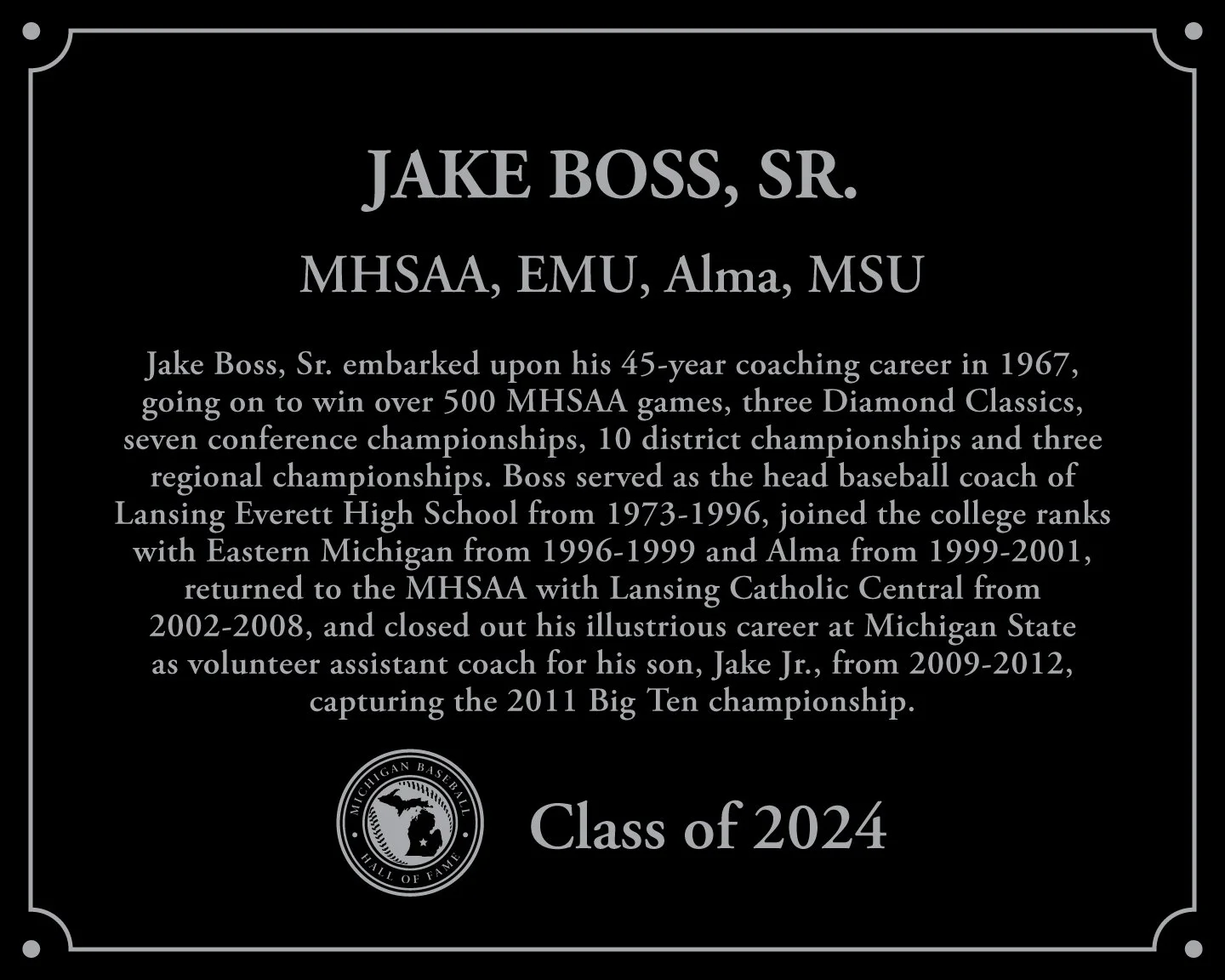 Jake Boss, Sr. coached for 45 seasons, a career that saw the Mid-Michigan legend win over 500 MHSAA games, three Diamond Classics, seven conference championships, 10 district championships, and three regional championships.